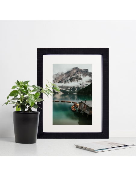 Marco de madera tipo caja con galce al fondo de 1.7cms de frontal y 3cm de profundidad. Disponible en negro gravado y blanco gravado.