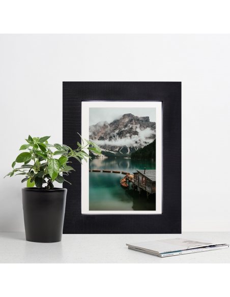Marco de madera tipo taco con galce al fondo de 3cms de frontal y 3cm de profundidad. Disponible en negro gravado y blanco gravado.