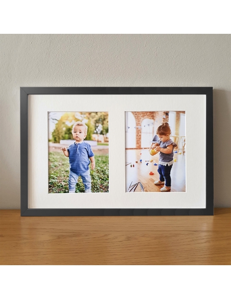 Crea tu marco multifoto personalizado. Sube tus fotos y te las imprimimos en calidad fotográfica, las enmarcamos con un passe-partout con varias ventanas en un marco de 1.7cm de ancho con frontal de metacrilato y trasera de cartón pluma. Elige entre las combinaciones disponibles y selecciona el color del marco: blanco o negro mate. Te lo enviamos listo para colgar.