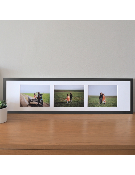 Crea tu marco multifoto personalizado. Sube tus fotos y te las imprimimos en calidad fotográfica, las enmarcamos con un passe-partout con varias ventanas en un marco de 1.7cm de ancho con frontal de metacrilato y trasera de cartón pluma. Elige entre las combinaciones disponibles y selecciona el color del marco: blanco o negro mate. Te lo enviamos listo para colgar.