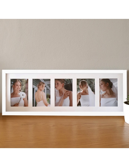 Crea tu marco multifoto personalizado. Sube tus fotos y te las imprimimos en calidad fotográfica, las enmarcamos con un passe-partout con varias ventanas en un marco de 1.7cm de ancho con frontal de metacrilato y trasera de cartón pluma. Elige entre las combinaciones disponibles y selecciona el color del marco: blanco o negro mate. Te lo enviamos listo para colgar.
