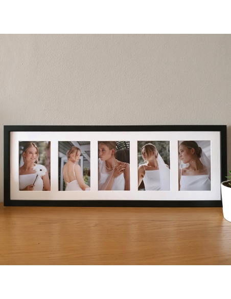 Crea tu marco multifoto personalizado. Sube tus fotos y te las imprimimos en calidad fotográfica, las enmarcamos con un passe-partout con varias ventanas en un marco de 1.7cm de ancho con frontal de metacrilato y trasera de cartón pluma. Elige entre las combinaciones disponibles y selecciona el color del marco: blanco o negro mate. Te lo enviamos listo para colgar.
