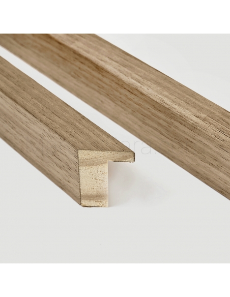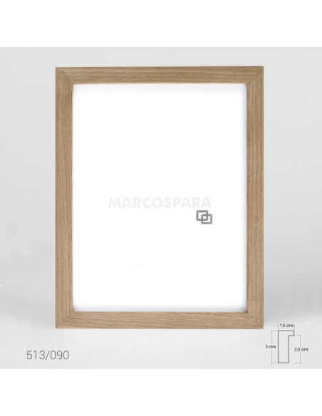 Marco de madera tipo taco de 1.5cms de frontal y 3cm de profundidad, disponible en color roble, haya, maple y nogal.